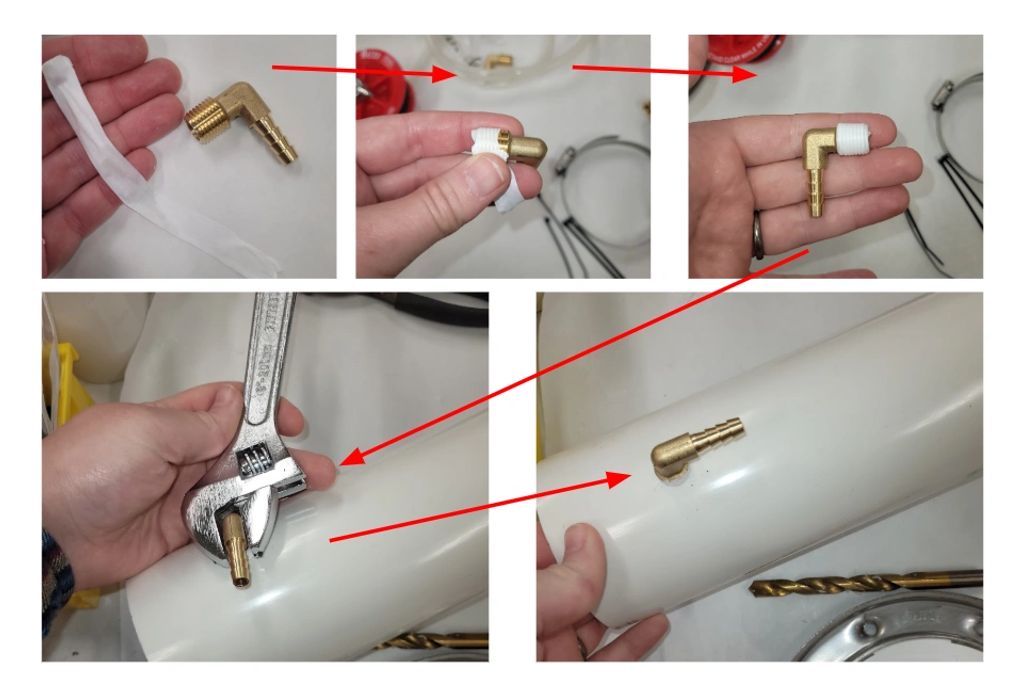 1) Wrap teflon tape around the thread on the brass 1/4" NPT to 1/4" barb fitting until it is tight and wrapped several times