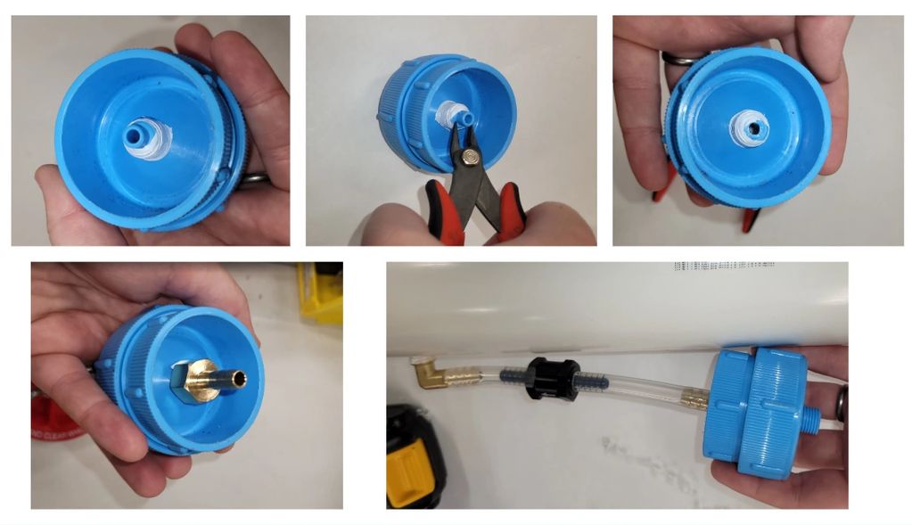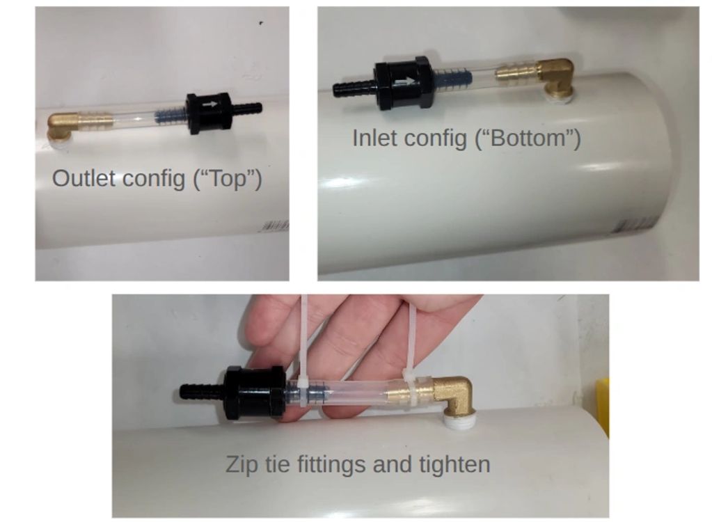 3) On the bottom, attach a 2" tube to the barb fitting and the outlet of the second check valve to th