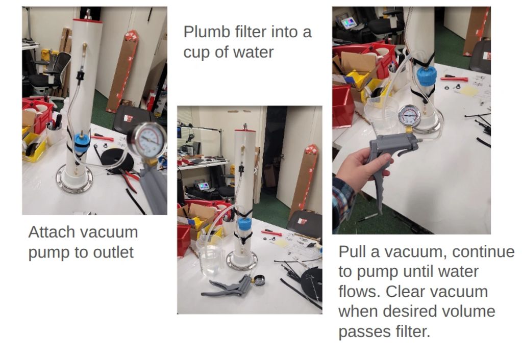 3) Pull 5-10 inHg vacuum using the vacuum pump. Continue to pump until desired volume passes through the filter.